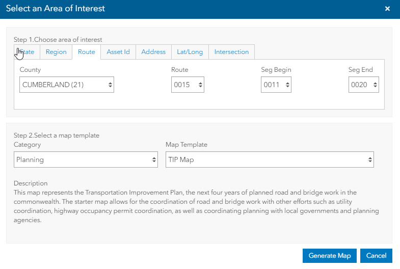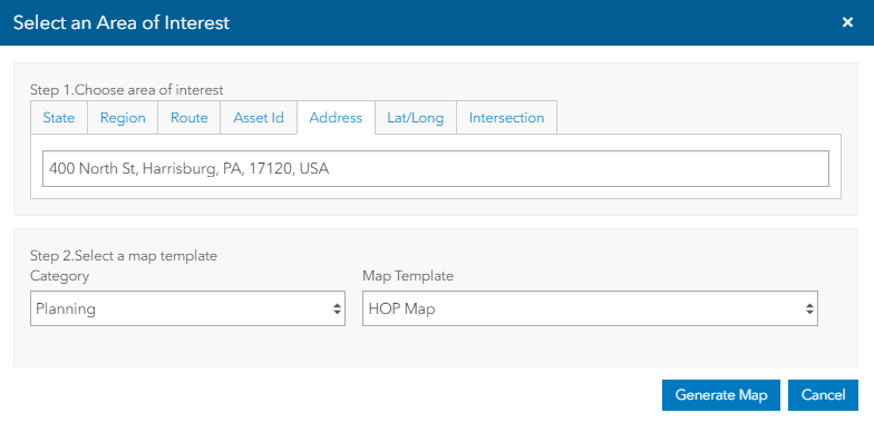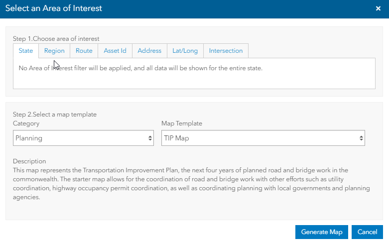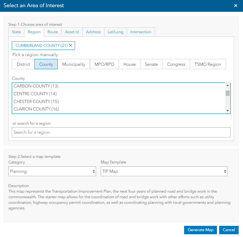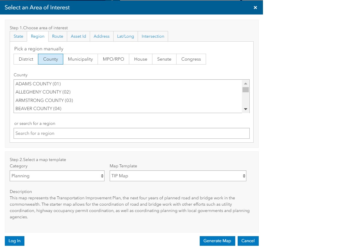 The Area Of Interest (AOI) Tool is the first thing that you see when PennDOT One Map loads. This tool is used to select the region or specific location that you would like to view, it can then filter any layers added to the map