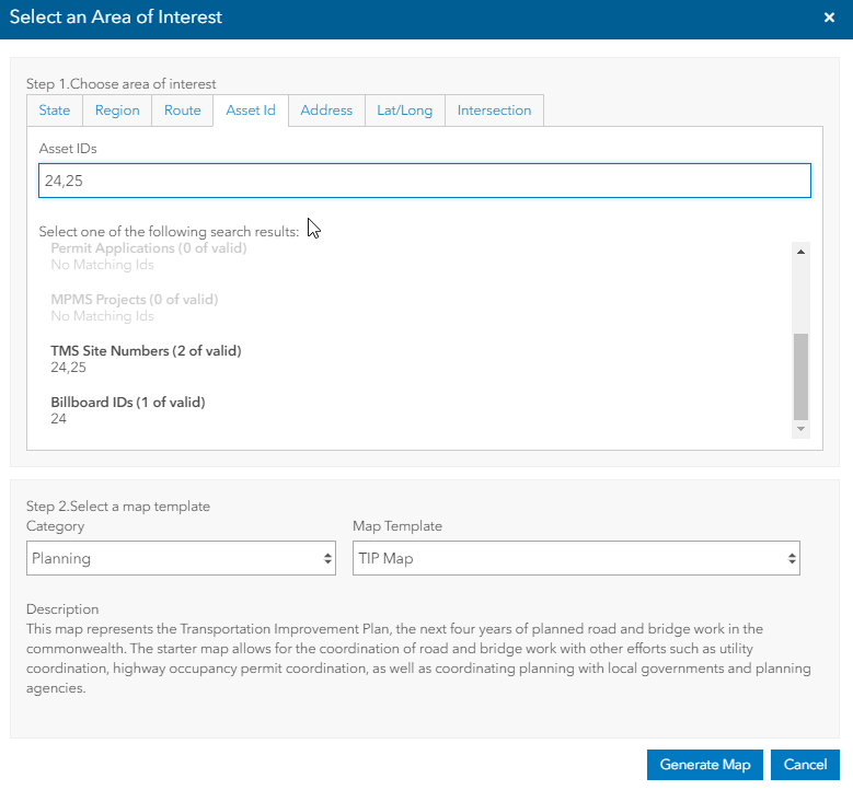 Asset ID allows you to search by specific Bridge Key, Project ID, HOP App ID or HOP Permit Number. You can enter multiple comma or space separated numbers.