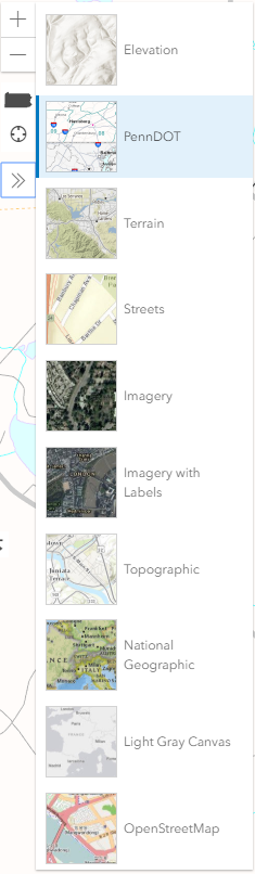 When first loaded, PennDOT One Map displays the entire Commonwealth of Pennsylvania by default. You can zoom in an out using these map controls: